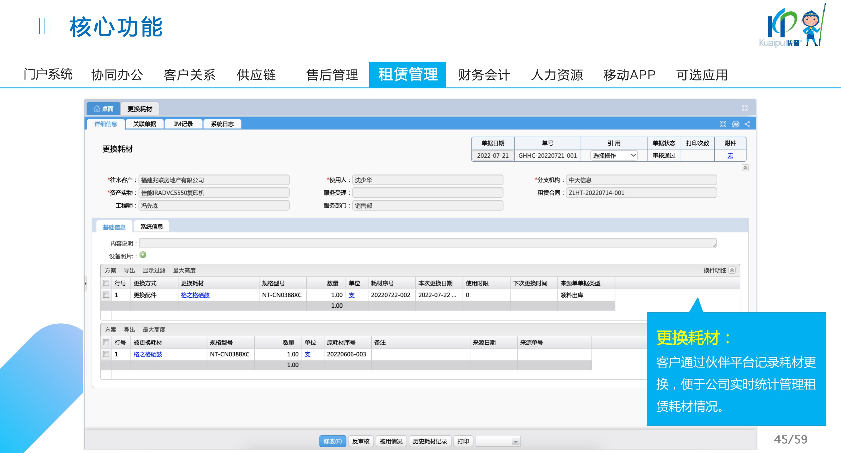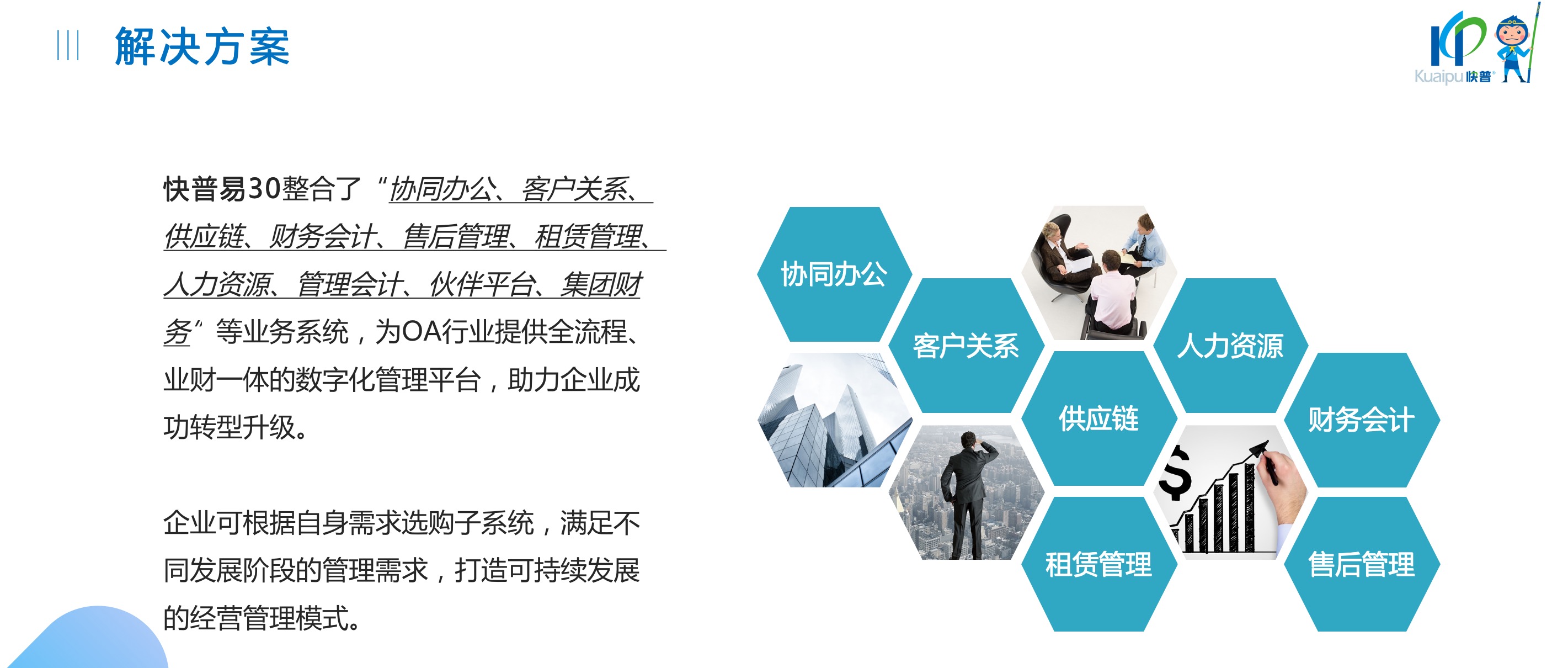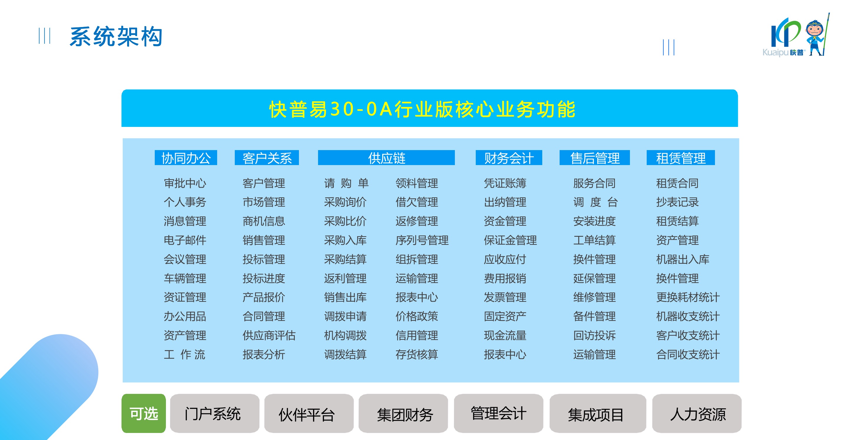 快普易30基于快普近20年在全國上萬家OA企業(yè)的實(shí)施與服務(wù)經(jīng)驗(yàn),融合了行業(yè)成功的管理智慧,以“客戶+機(jī)器”為中心提供數(shù)字化轉(zhuǎn)型解決方案,全面解決銷售、服務(wù)、租賃等多種業(yè)務(wù)模式的管理需求,以及企業(yè)經(jīng)營核算分析。