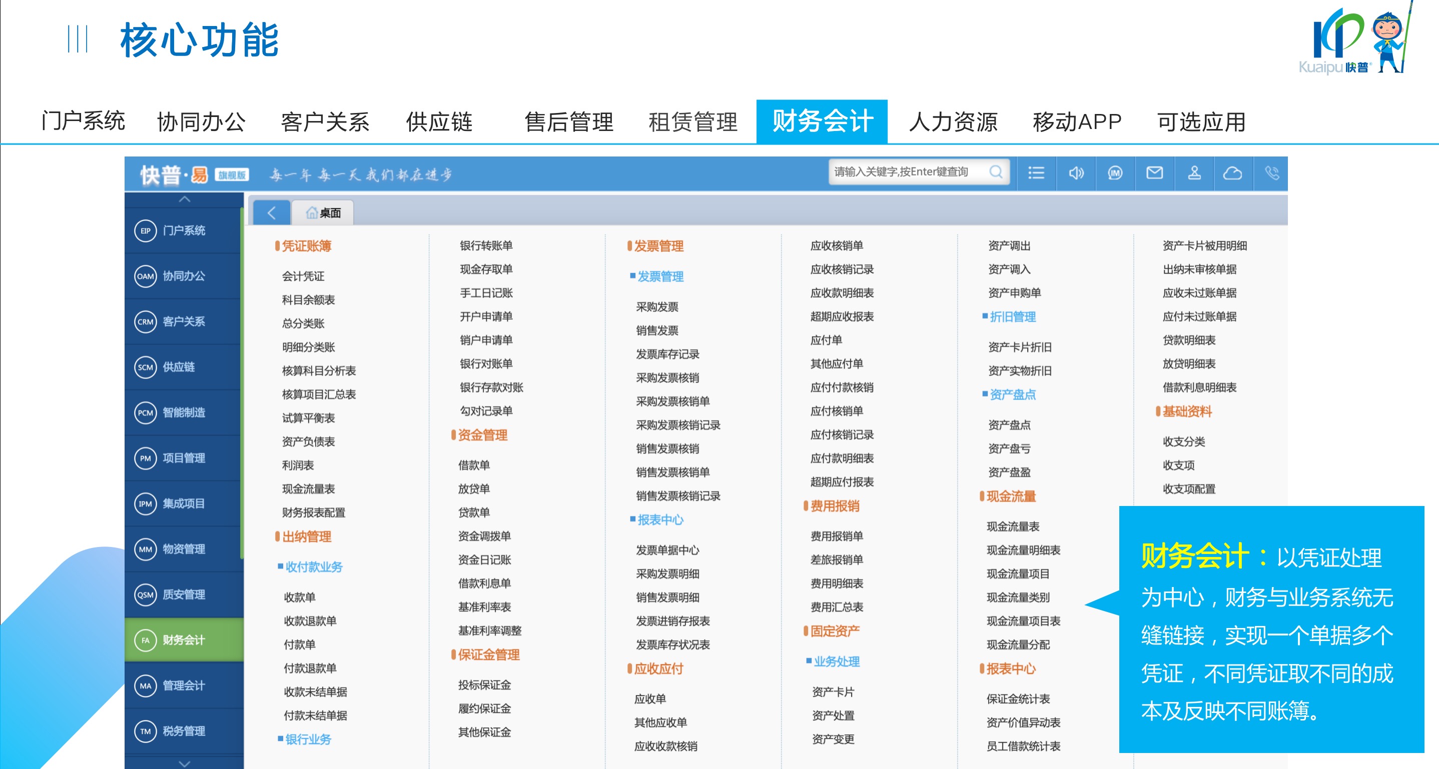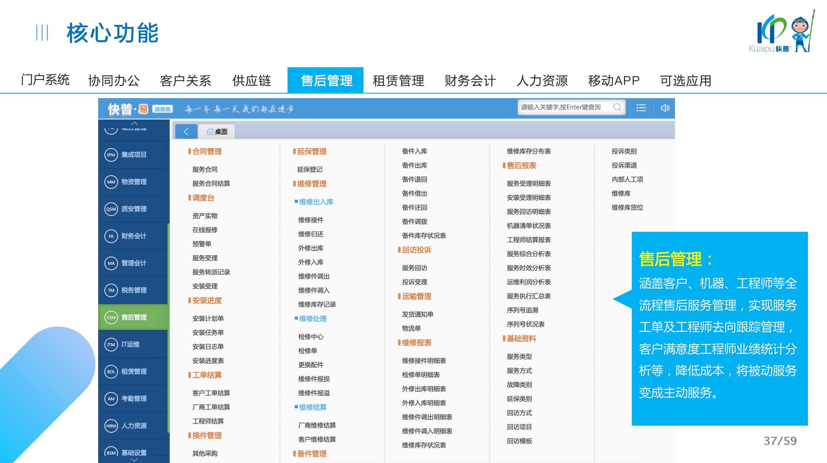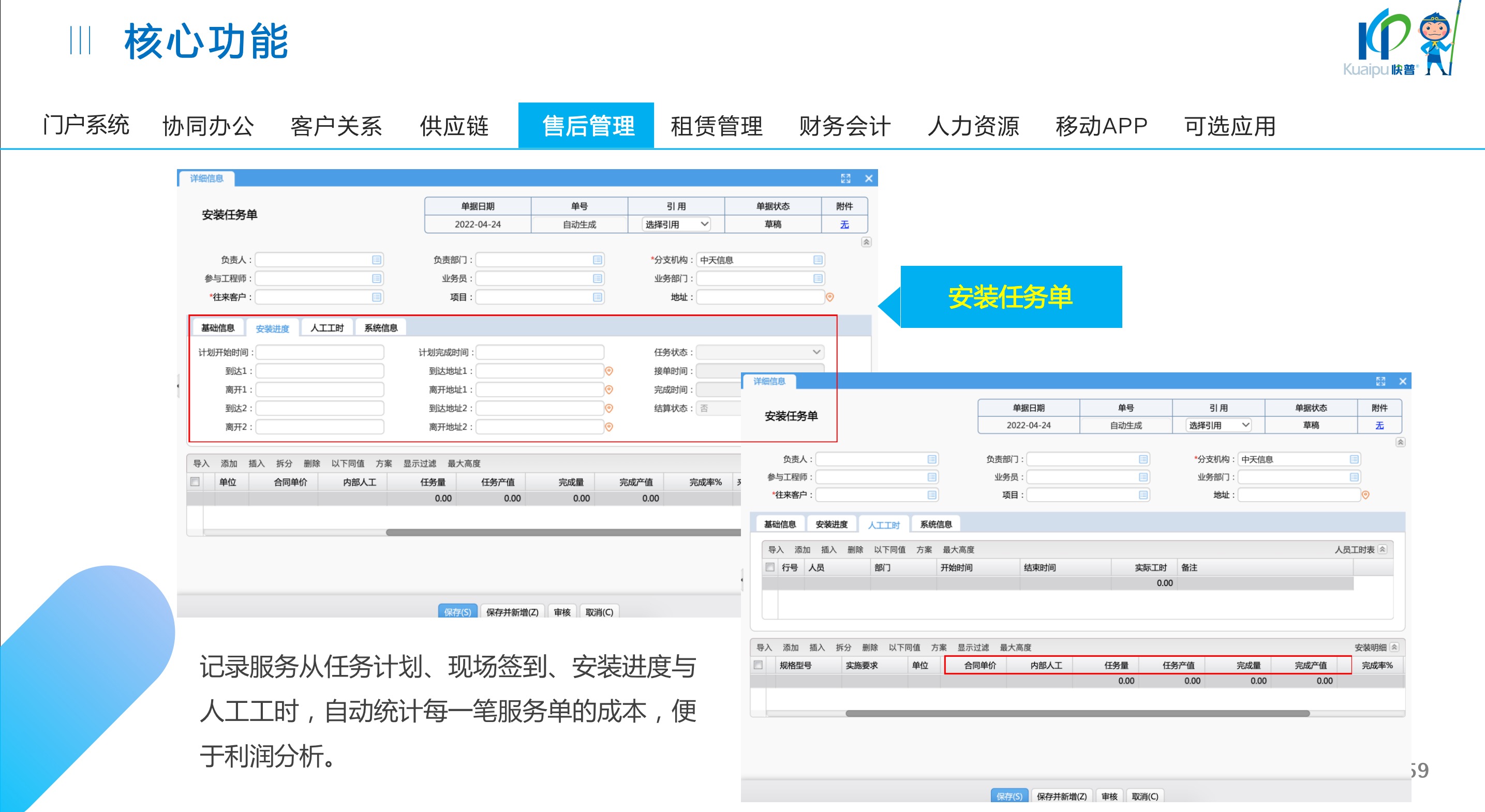 快普易30基于快普近20年在全國上萬家OA企業(yè)的實(shí)施與服務(wù)經(jīng)驗(yàn),融合了行業(yè)成功的管理智慧,以“客戶+機(jī)器”為中心提供數(shù)字化轉(zhuǎn)型解決方案,全面解決銷售、服務(wù)、租賃等多種業(yè)務(wù)模式的管理需求,以及企業(yè)經(jīng)營核算分析。