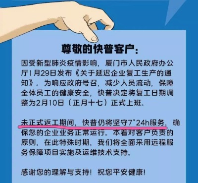 公司第一時(shí)間發(fā)布服務(wù)公告:未正式返工期間,快普將為客戶提供7*24h服務(wù),客戶可通過遠(yuǎn)程方式獲取運(yùn)維及項(xiàng)目實(shí)施等服務(wù)。
