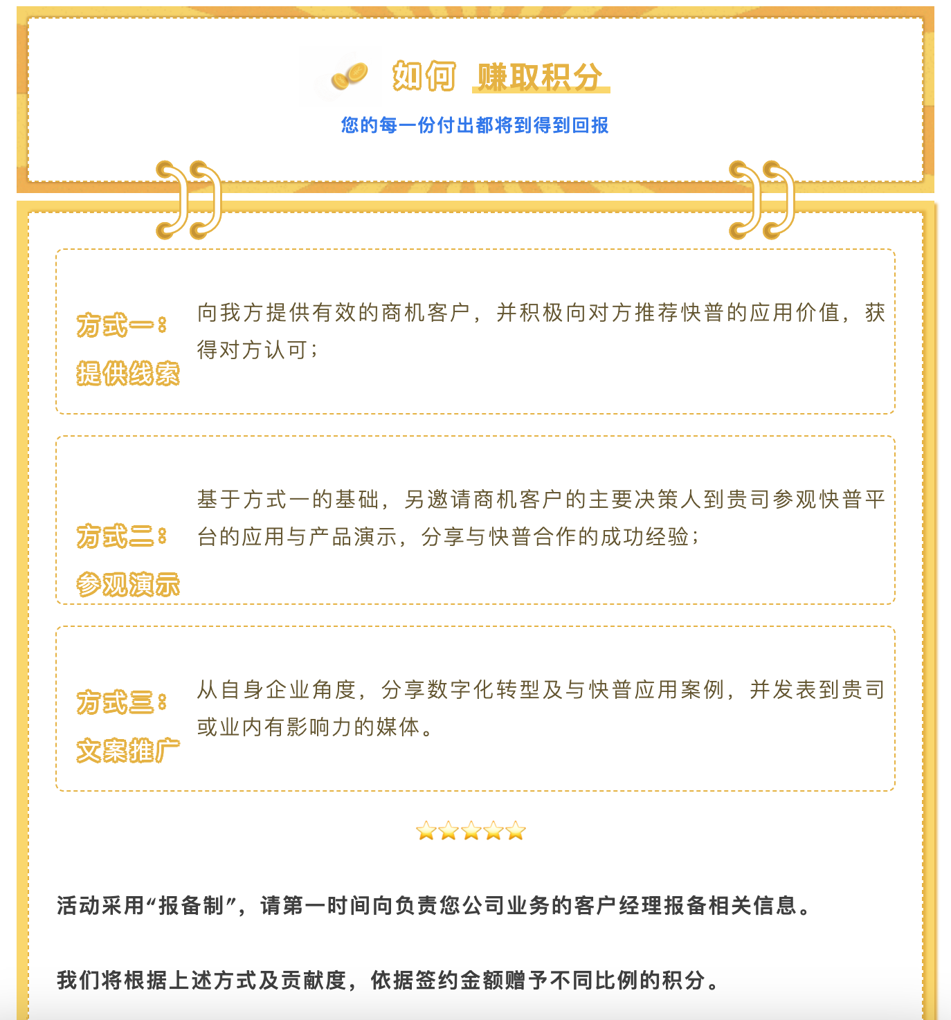 為進(jìn)一步回饋老用戶的貢獻(xiàn),現(xiàn)誠(chéng)邀您參與“快普感恩回饋大行動(dòng)!”,與我們共享數(shù)字經(jīng)濟(jì)發(fā)展的紅利!通過主動(dòng)推薦、轉(zhuǎn)介紹客戶,您將獲取豐厚的積分返利,讓您的每一份付出都得到實(shí)質(zhì)性的回報(bào),人脈資源也可以獲得變現(xiàn)!