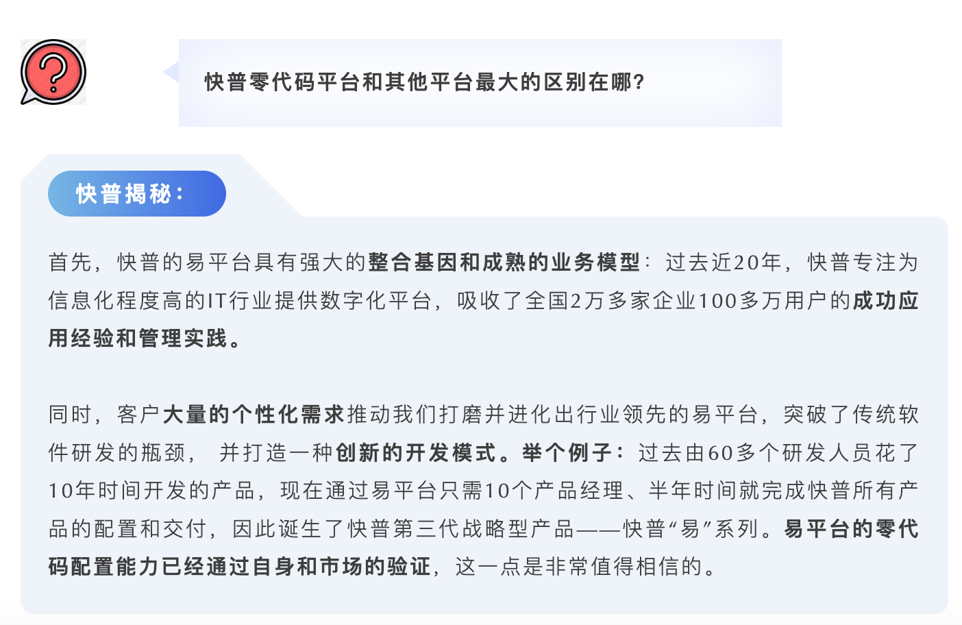 是的,我們可以很自信地說“快普零代碼平臺讓數(shù)字化轉(zhuǎn)型變得簡單、可行”。這個是面對數(shù)字化轉(zhuǎn)型的所有角色而言的,包括我們自身軟件研發(fā)、實(shí)施交付,以及合作伙伴、用戶等,易平臺在效率、成本、技術(shù)門檻和可擴(kuò)展性等方面來說都有著顛覆性的突破,是非常有意義和必要的基礎(chǔ)設(shè)施??偨Y(jié)說有下面幾點(diǎn):