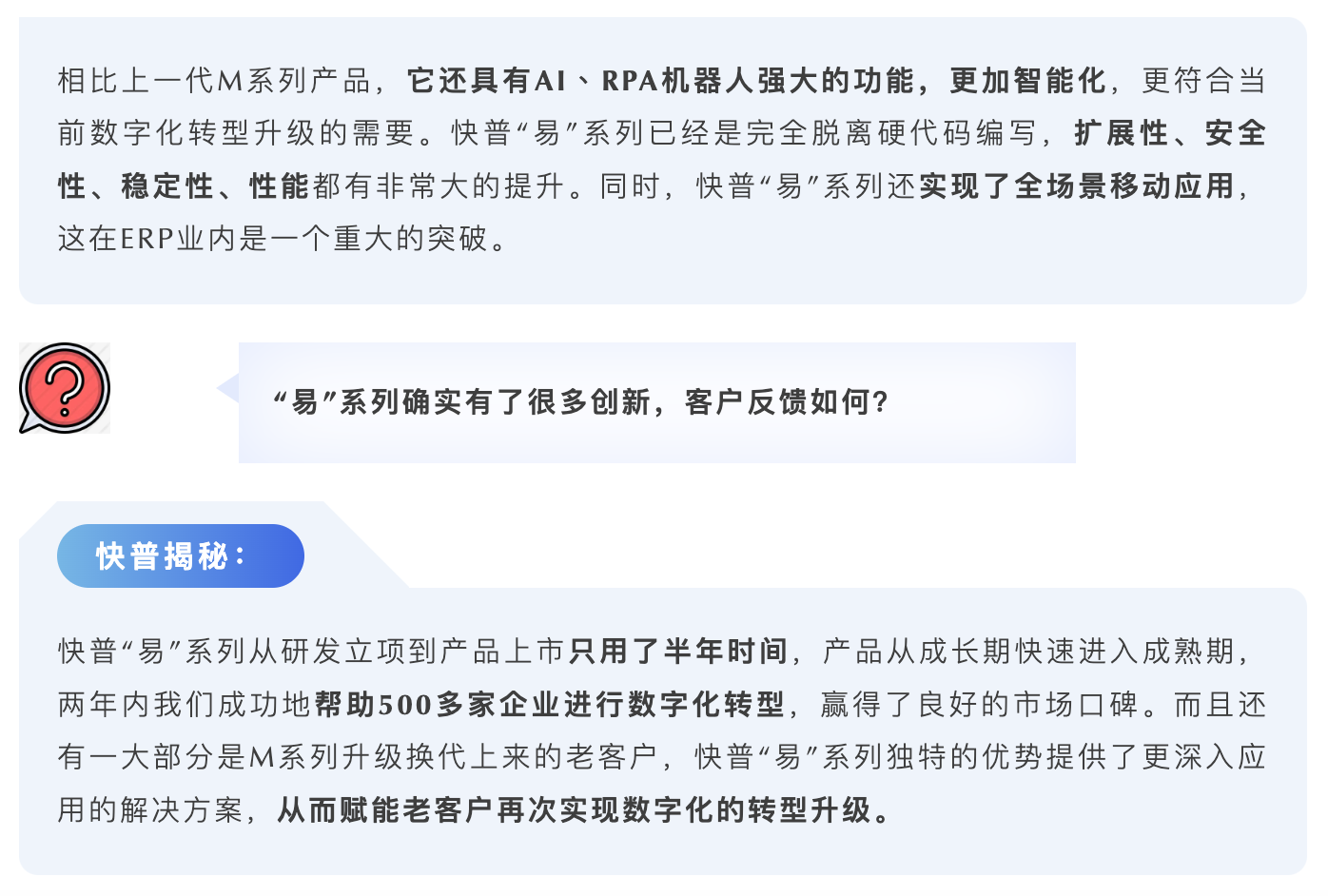 傳統(tǒng)的軟件開發(fā)需要很多經(jīng)驗(yàn)豐富的編程人員,每個人的技術(shù)水平、寫法各不同,而易平臺可大大減少因人為編碼錯誤而引起的bug。平臺所有配置邏輯都是“開源”可視的,所有人員都看得懂產(chǎn)品的配置信息,問題定位也更快更準(zhǔn)確。此外,平臺還支持按明細(xì)生成升級腳本,bug修復(fù)和需求交付更高效。隨時能調(diào)整、發(fā)布、更新,也使得產(chǎn)品維護(hù)和升級更便捷,這些優(yōu)勢都進(jìn)一步加強(qiáng)了產(chǎn)品的穩(wěn)定可靠。