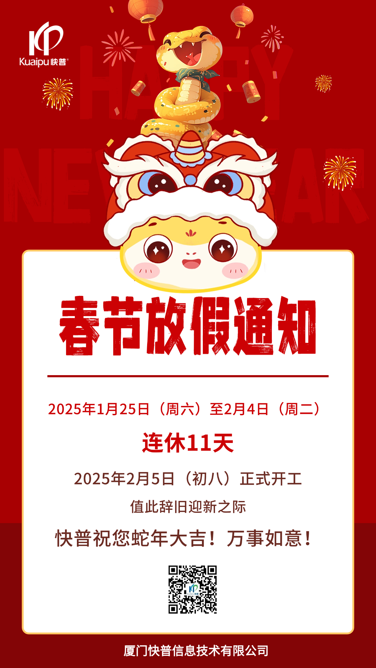 2025年春節(jié)即將到來(lái),快普公司全體員工提前恭??炱沼脩?hù)在新的一年里,生活美美滿(mǎn)滿(mǎn),事業(yè)紅紅火火,財(cái)源滾滾而來(lái),家庭和和美美,幸福永遠(yuǎn)常在。