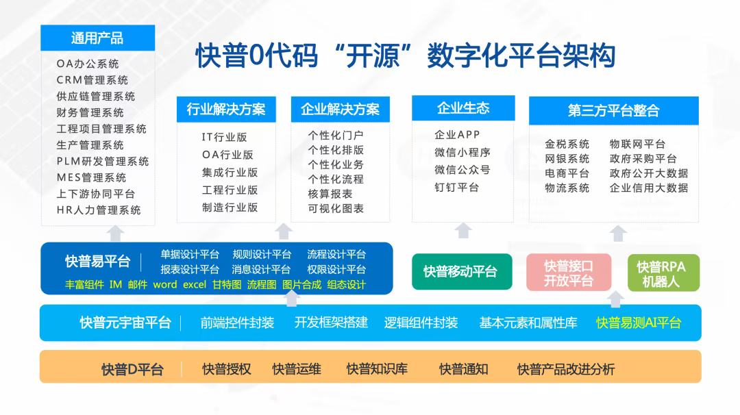 為此,快普依托自主研發(fā)的“快普易”整合管理平臺(tái),以先進(jìn)的技術(shù)架構(gòu)為企業(yè)提供簡(jiǎn)單、靈活的應(yīng)用體驗(yàn)。平臺(tái)具備零代碼配置、多系統(tǒng)無(wú)縫整合、AI深度嵌入等核心優(yōu)勢(shì),為企業(yè)提供一條“小快輕準(zhǔn)”的數(shù)字化轉(zhuǎn)型路徑: